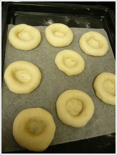 丸く8等分した(等分してるはずなんだけど・・・大きさにバラつきが!)パン生地に、真ん中に指をいれて、ドーナツ型の器にしていきます。
