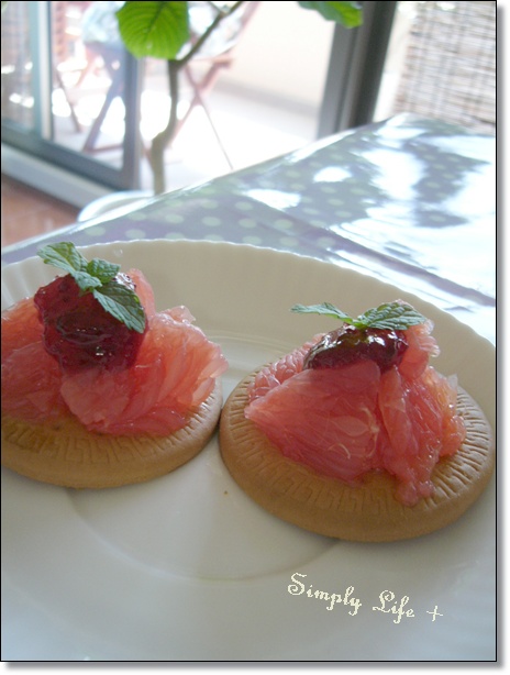 ピンクグレープフルーツだけだと、苦味が少しあるのですが、甘酸っぱいクランベリージャムのおかげで、ほどよいカンジになり、ビスケットと相性ピッタリです☆