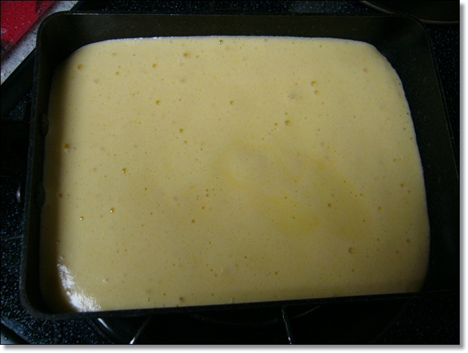 生地をあわ立てて、ミックス粉を混ぜて・・・たまご焼き器に流し込んだ状態です。