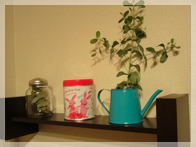 昨日、セリアで見つけた、カラフルなジョーロに、ユーカリを挿して・・・