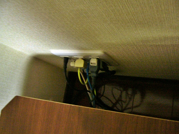 マルチコンセントなので、普通のコンセントとは違って、LANケーブル、TVの線、電源タップの線・・・など色々なんで、こんなにごっちゃりしたカンジが出ています。