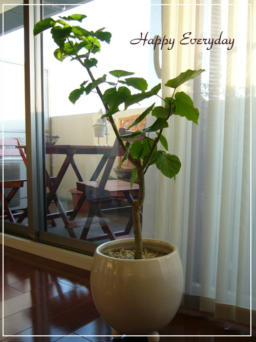 鉢も黒鉢を希望していましたが、こうやってみるとウンベラータは、ほんわかしたこういう丸い白い鉢がお似合いな気がします。
