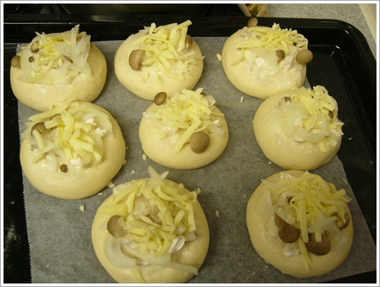 成型発酵終了後は、しめじを埋め込むように入れていきます。