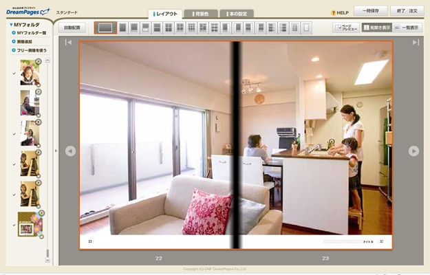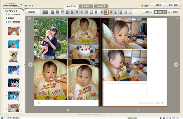 左側にアップした写真一覧があって、右側がページプレビューになります。