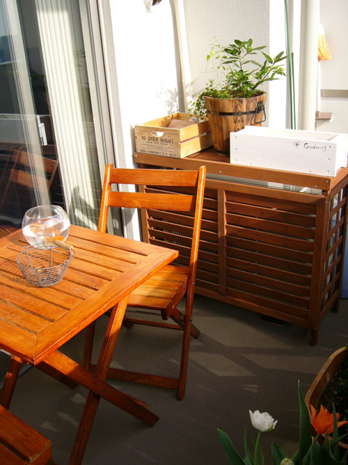 ベランダが広々しているので、いつもは、ひっそり片方だけに置いている、鉢とか、椅子、テーブル類を昨日、思いっきり広げてレイアウトしてみました。