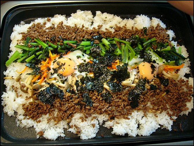 それぞれの具をホットプレートで炒めて、一旦お皿に出し、最後にごま油をひいてから、ごはんを平らにして、具を並べていきます。