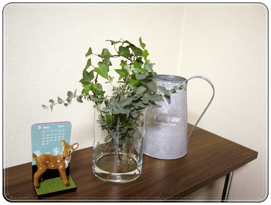 飾り棚の上には、グリーンとバンビちゃんカレンダー。