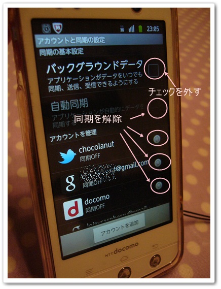 バックグラウンドデータ、自動同期をすべて解除しておきます。