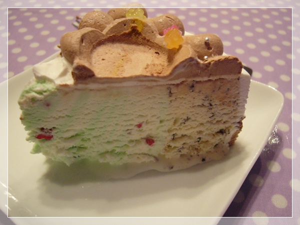 切り分けたアイスクリームのケーキの断面は、こんなかんじ。