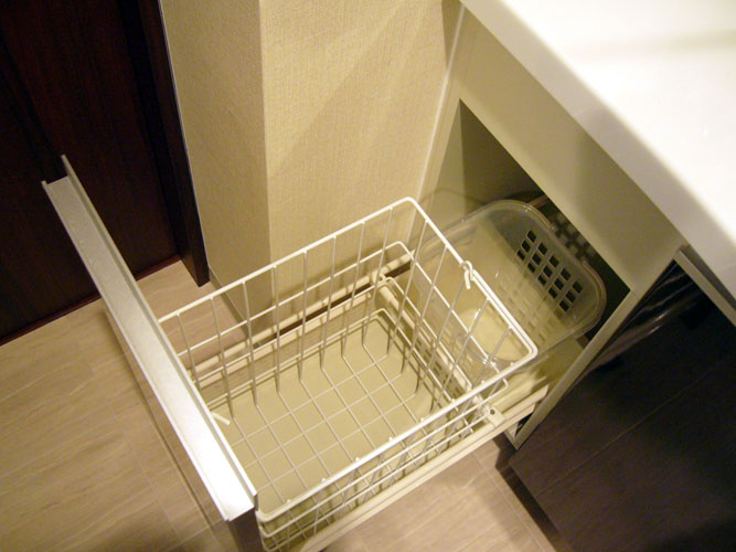 >20年程前に建てた実家の洗面所が、こんなふうになってたのを思い出し、使いみちの無かった幅広深型の引き出し部に洗濯物を入れています。