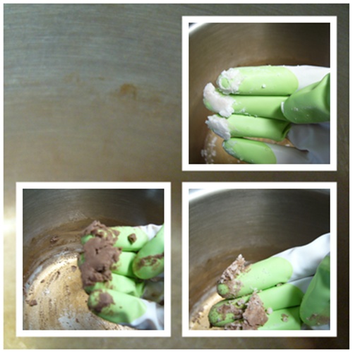 写真の上から、お掃除前の重曹ペースト → ちょっとこすってみた → かなりこすってみた