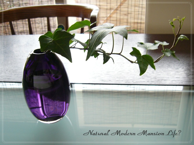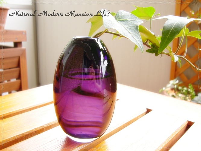 この花瓶、とってもキレイ。形もしずくみたいでかわゆい。光の当たり具合で紫に変化があって倍楽しい感じ♪