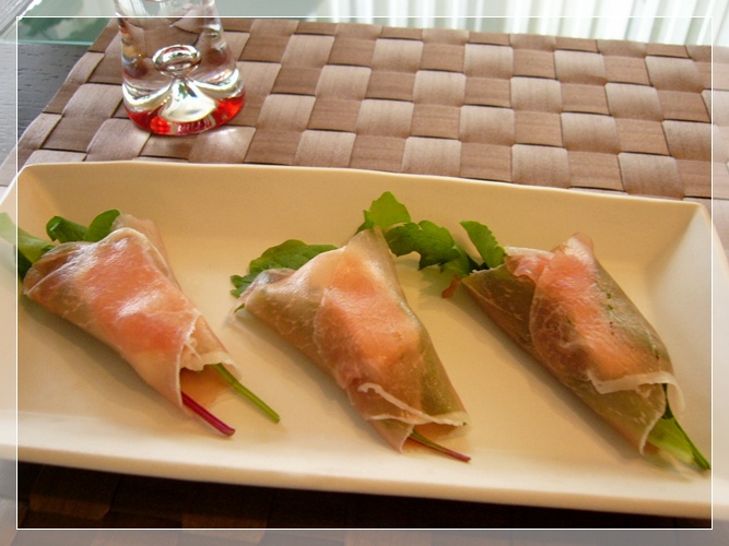 ベビーリーフとガーリック&ハーブのクリームチーズを、生ハムで巻いてみました。