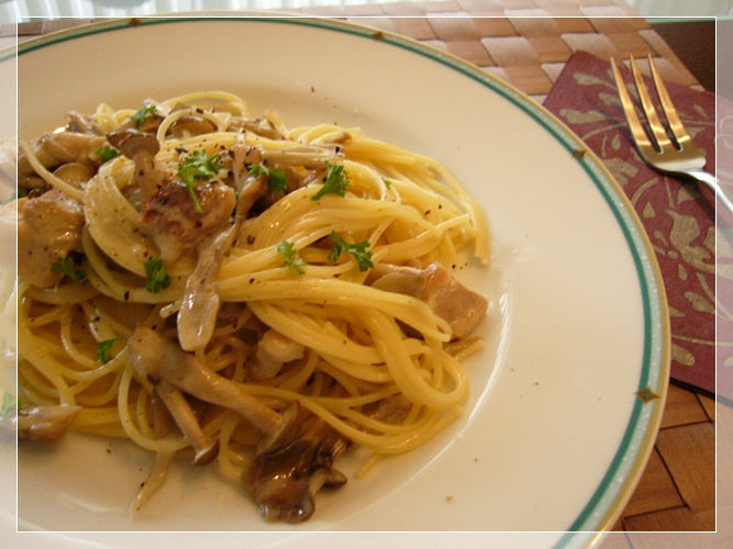 パスタは、きのこと鶏肉のクリームソース
