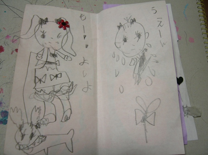 友達のコの、お絵かきノート(じゆうがちょう)にウチの娘が半分までは行かなくてもそれ近く、絵を描いててね。。