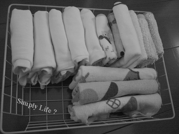 肌着やタオル類は、ばらつきがちなので、こんな風にピンク色のカゴに入れてます。