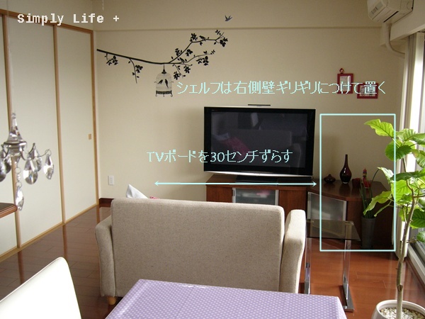 シェルフを右側壁に、限りなくくっつけて新しいTVボードを置く案です。