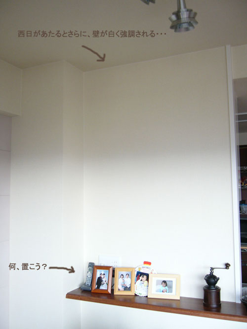 >前記事のfufuさんのCMにもあったように、カウンターにボーンと何か大きいものを置いてみると、のっぺりした壁の印象もなくなるし、カウンターそのものへ視線が集中することもないのでは?