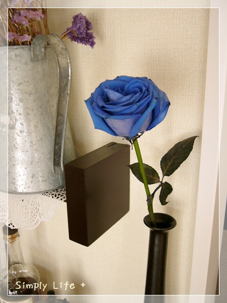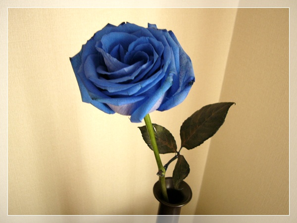 昨日、ちょうどお買い物へいったとき、青い薔薇が売られているのを見つけて、一輪だけですが買ってきました。