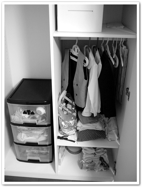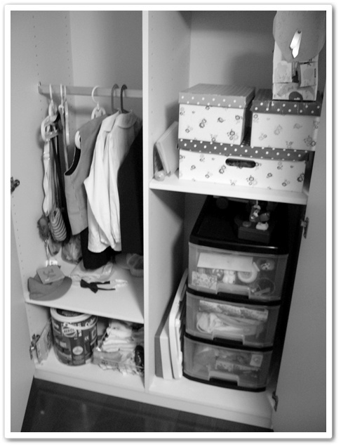 元々、二つ並べてましたが、あまりに『黒』という色が、目だってうっとおしいので、おもちゃを減らし、ひとつにしてからクローゼットの中へ入れてみました。
