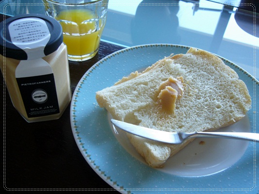 おうちで焼いた出来立てのパンにミルクジャムをたっぷりのせて・・・。
